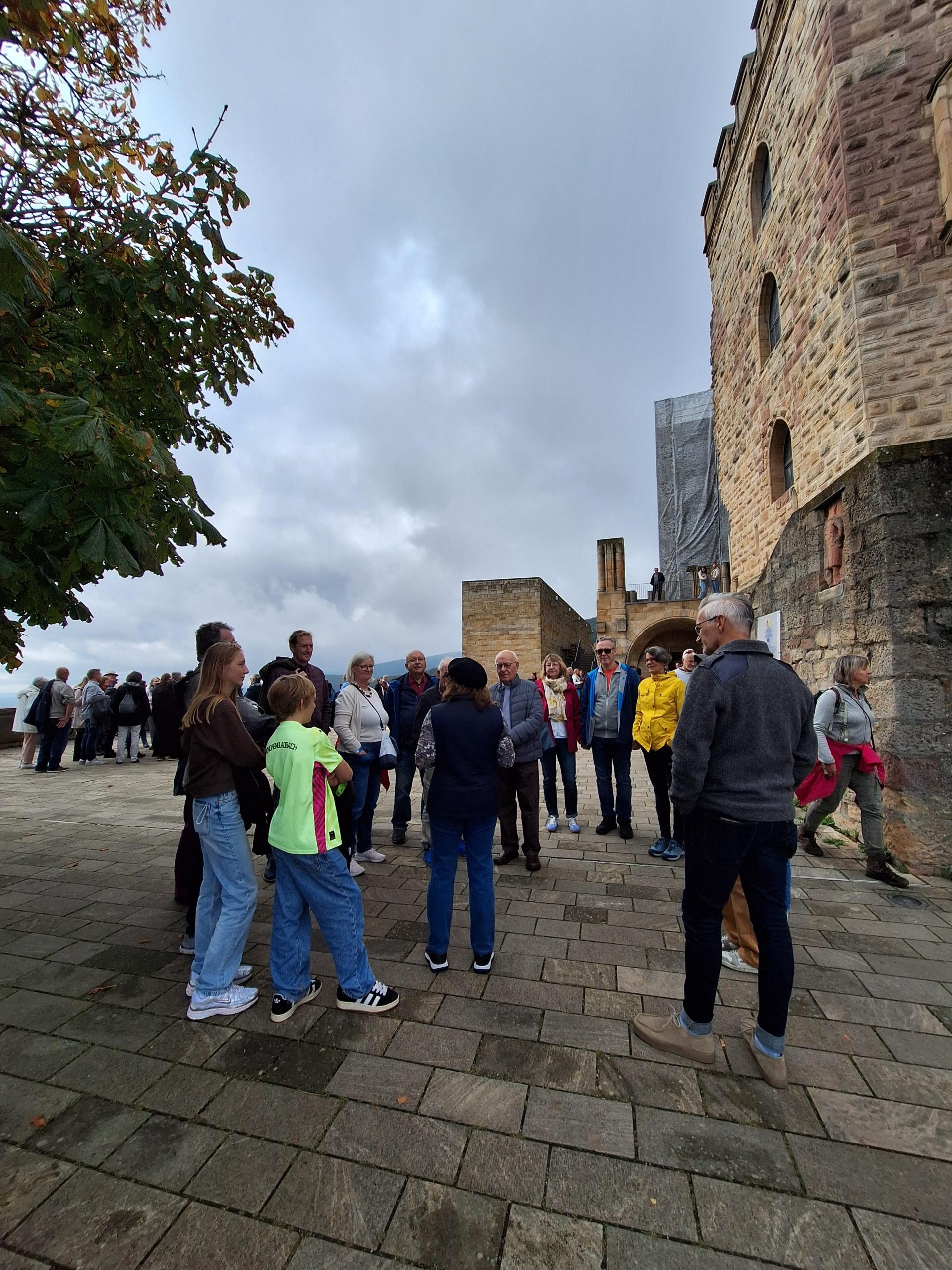 Nach der umfangreichen Stärkung ging es weiter Richtung Süden bis nach Hambach. Die Straße zum Schlossberg wirkte recht schmal, aber das Hambacher Schloss ist auf große Gruppen vorbereitet. Schließlich lernen hier Schülergruppen, aber auch Touristen aus aller Welt viel über die Wiege der Demokratie in Deutschland und Europa. Die Freien Sänger inklusive Familie und Freunde aus dem OGV (Obst- und Gartenbauverein Schöneck e.V.) erfuhren neben den interessanten Infos zum Gemäuer und den Ereignissen im Mai 1832 auch, dass allein drei Hochzeiten für den Tag eingeplant waren. Ein Brautpaar wurde nicht gesichtet. Dafür aber die Aussicht über die Rheinebene genossen.